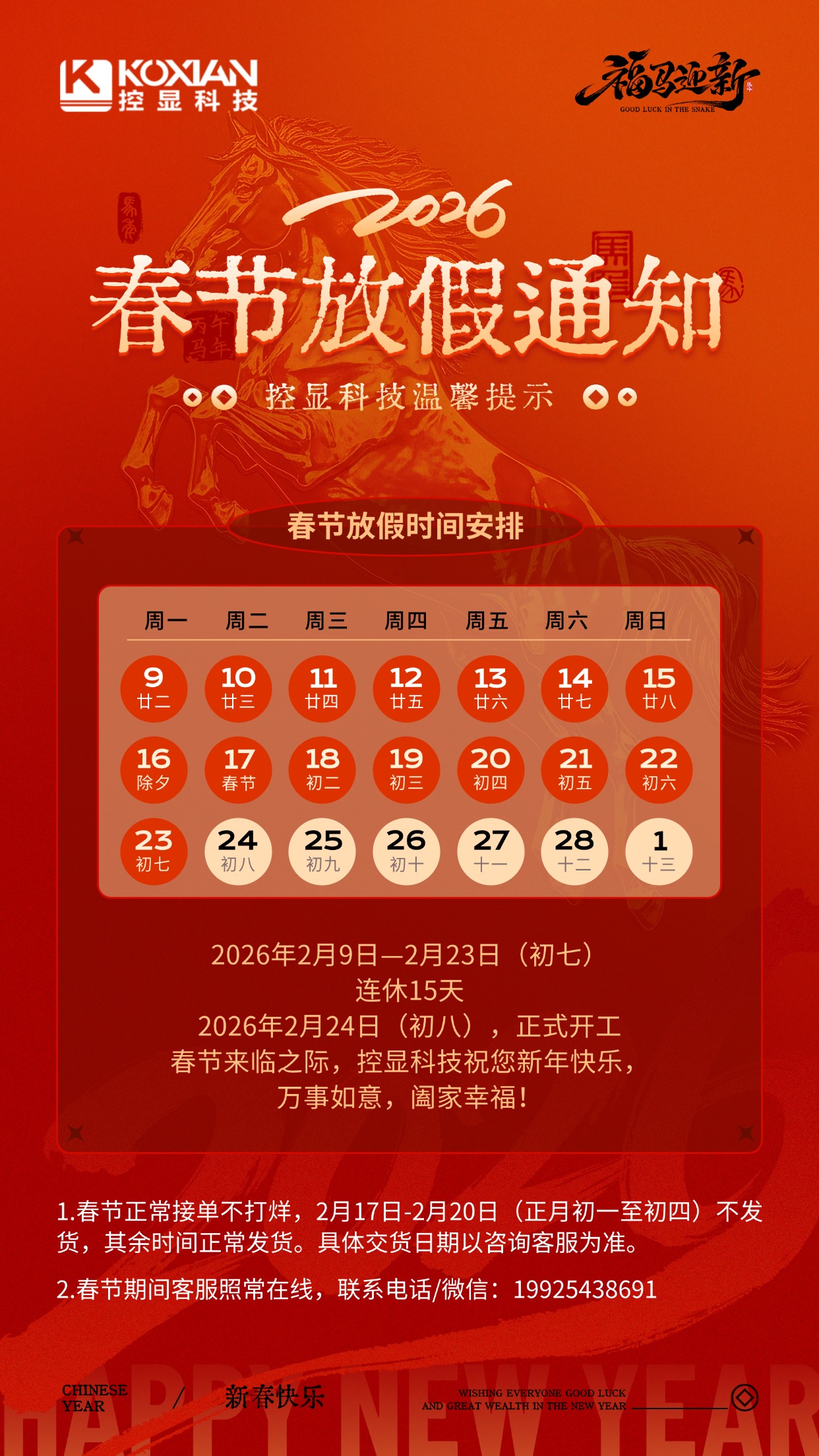 控显科技2026年春节放假通知,2026年2月9日—2月23日(初七)连休15天,2026年2月24日(初八),正式开工。春节期间客服照常在线,联系电话/微信:19925438691